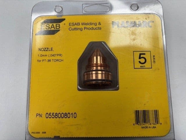Esab 0558008010 is a 1.0mm nozzle, designed for the PT-36 plasma cutting torch. The nozzle is rated for use with 45 to 55 amps.