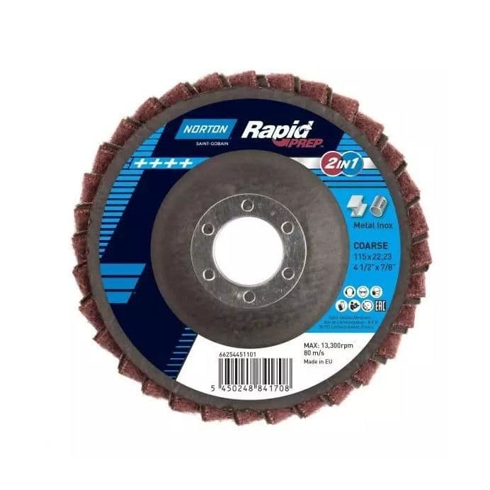 Saint Gobain Home / Shop By Brand / Saint Gobain / Norton 115mm P80 AMED Rapid Prep 2IN1 Norton 115mm P80 AMED Rapid Prep 2IN1 Norton 115mm P80 AMED Rapid Prep 2IN1 Quantity Range Unit Price Unit Saving 1 - 19 £12.90 No Saving 20+ £10.80 £2.10 Stock Status: In Stock Add to your Wish List Description Norton 115mm P80 AMED Rapid Prep 2IN1 Rapid Prep 2in1 is a versatile flap disc made of interleaved coated abrasive flaps and non-woven surface conditioning material. These versatile discs grind, smooth and finish in one step, reducing the need for multiple abrasive steps and offering a quick, versatile, lower-cost solution to achieve excellent surface finish results. A versatile hybrid flap disc made of interleaved coated abrasive flaps and non-woven surface conditioning material. Grind, smooth and finish in one step, reducing the need for multiple abrasive steps and offering a quick, versatile, lower-cost solution to achieve excellent surface finish results. Easy to use with a soft-cushioning effect, ideal for working on intricate contours and tube shapes without risk of gouging or damage Multitasking capability – grind, weld removal, deburr, blend-in, finish and refine. Reviews Customer reviews No reviews left yet Write a review Sort byMost RecentTop Rated No reviews have been left for this product, be the first to leave a review Attributes MPN: 66254451103 Brand: Norton Product Code: 66254451103